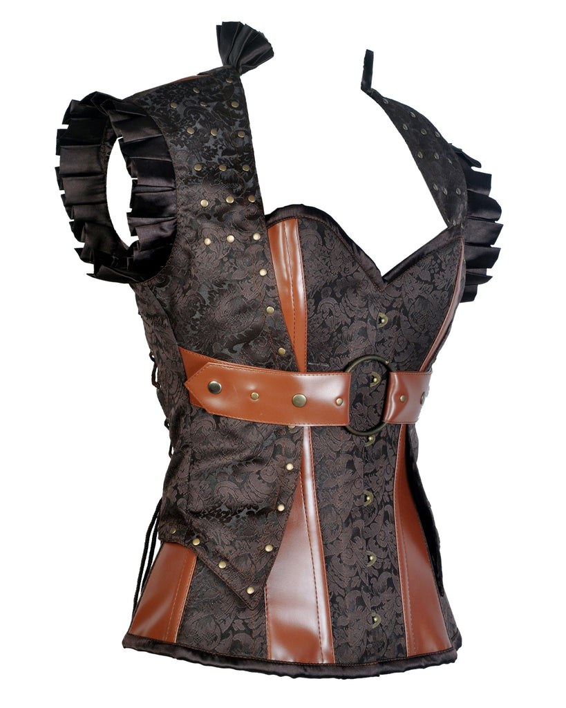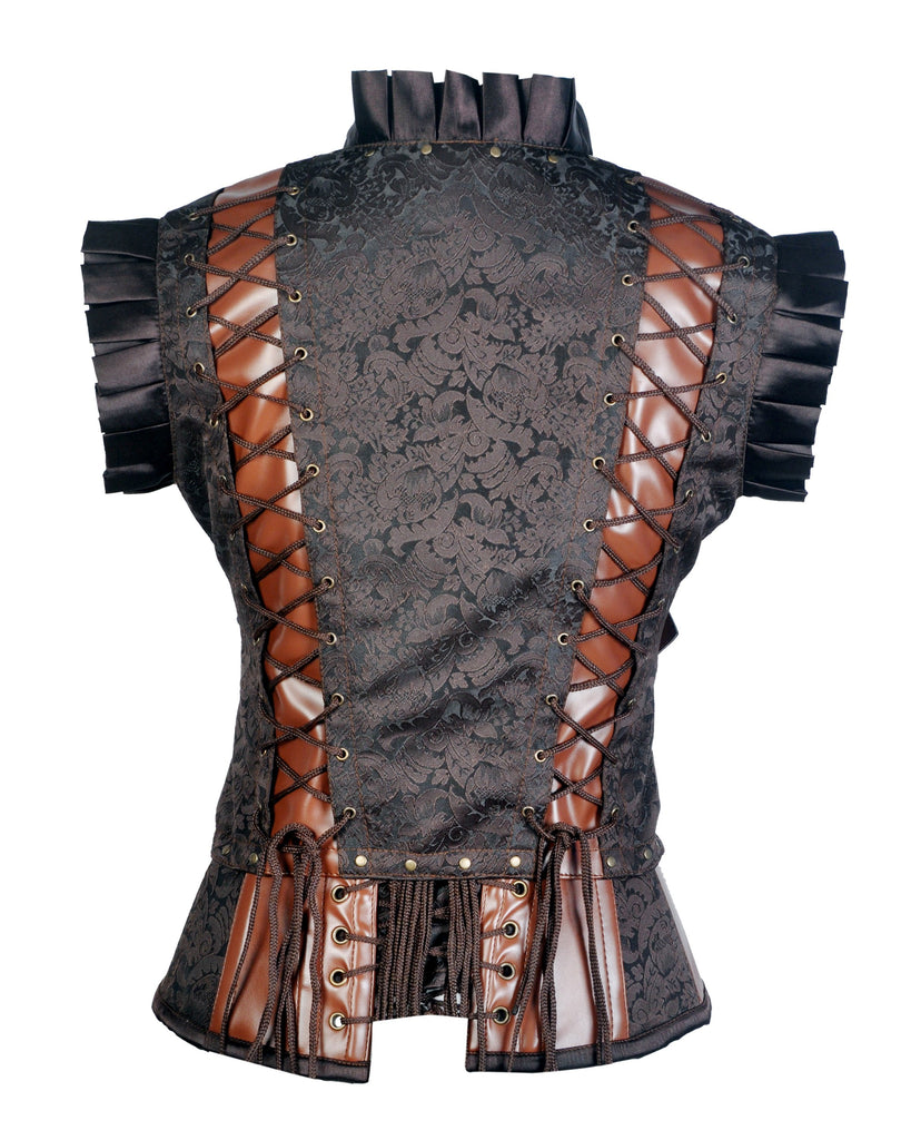 - Coffee Brown Brocade & Faux Leather Corset With Jacket