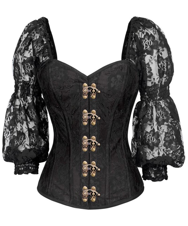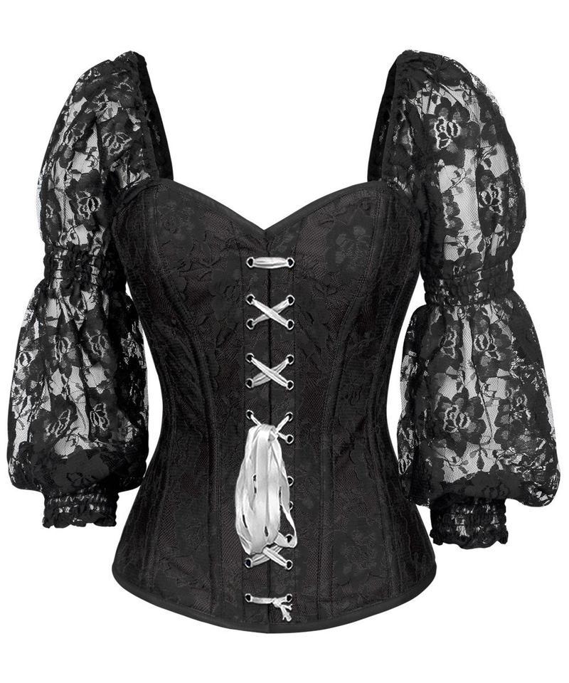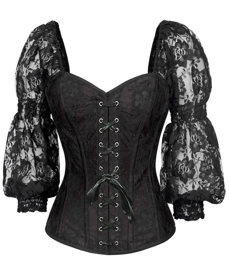 Spiral Steel Boned Lace Overlay Overbust Corset with Attached Sleeve