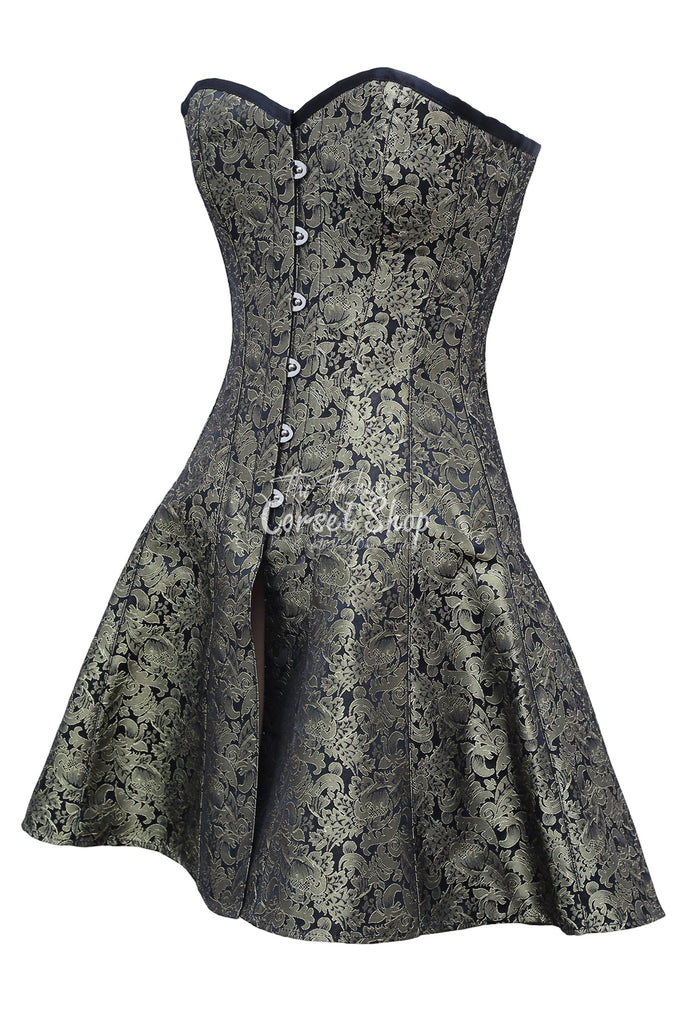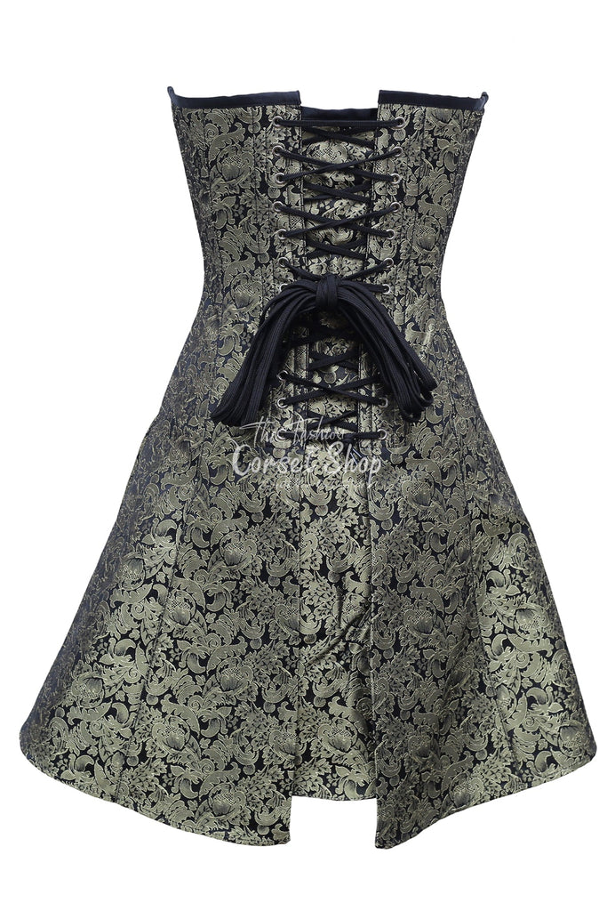 • Authentic Steel Boned Gold Black Brocade Overbust Long Corset Dress