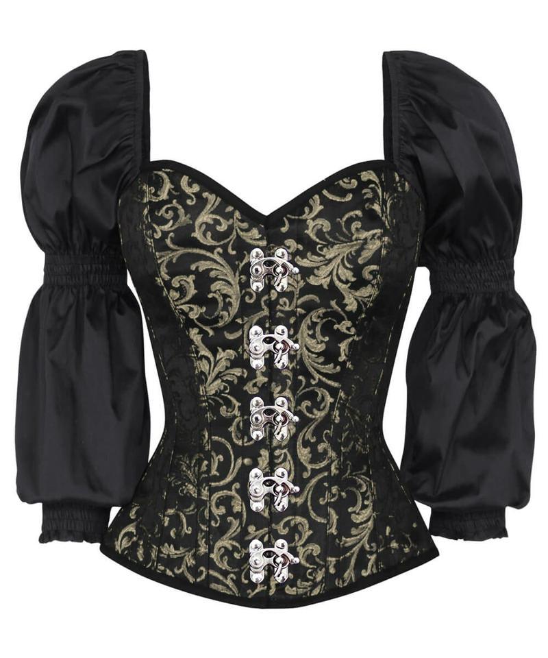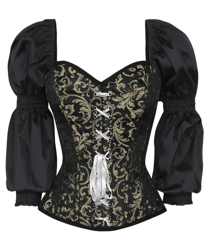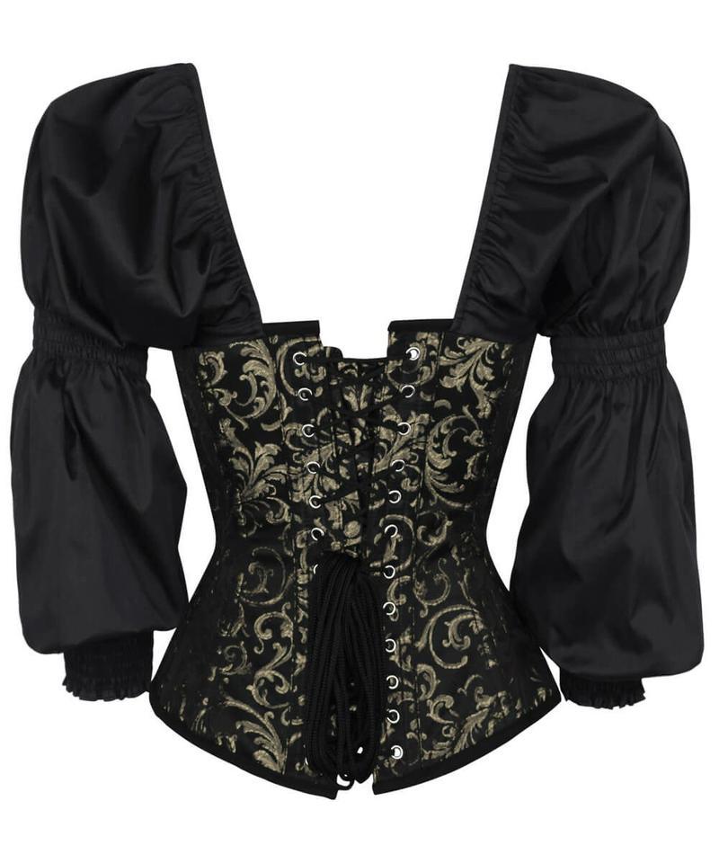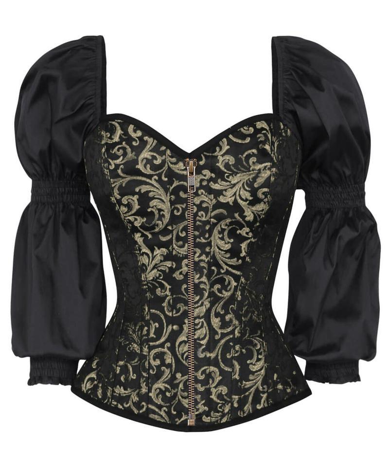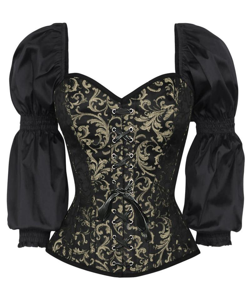 • Spiral Boned Brocade Gothic Overbust Corset with Attached Sleeve