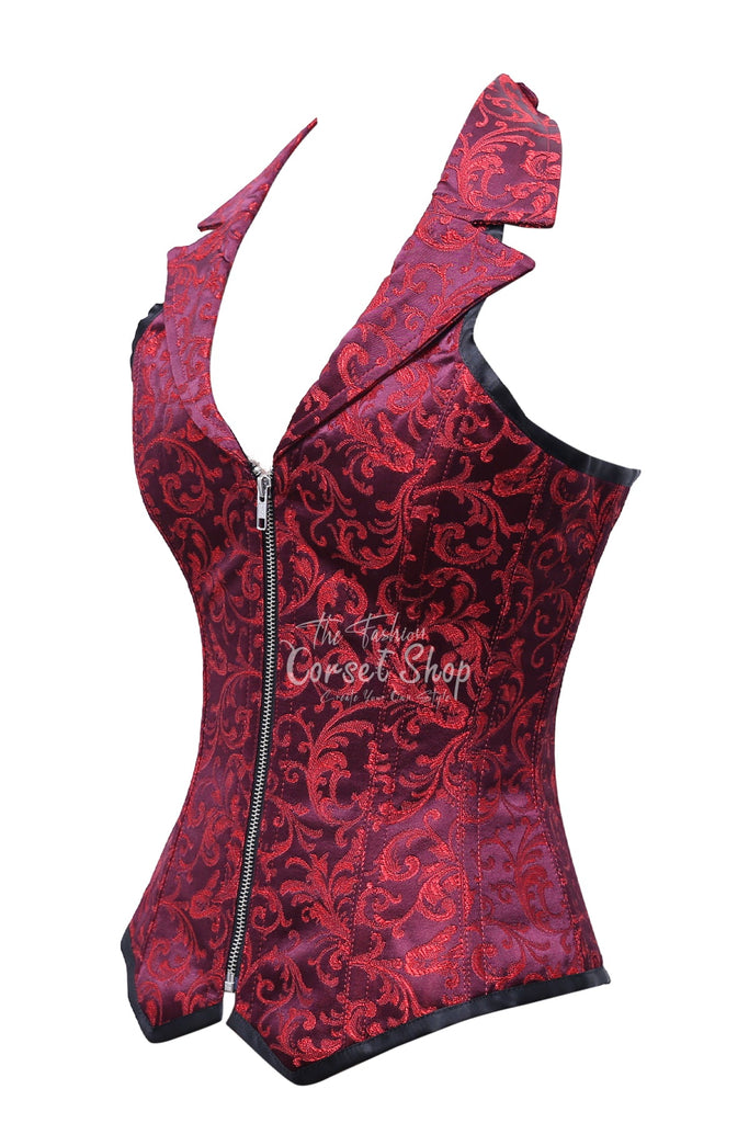 Saze Black Red Brocade Overbust Corset With Zip Front