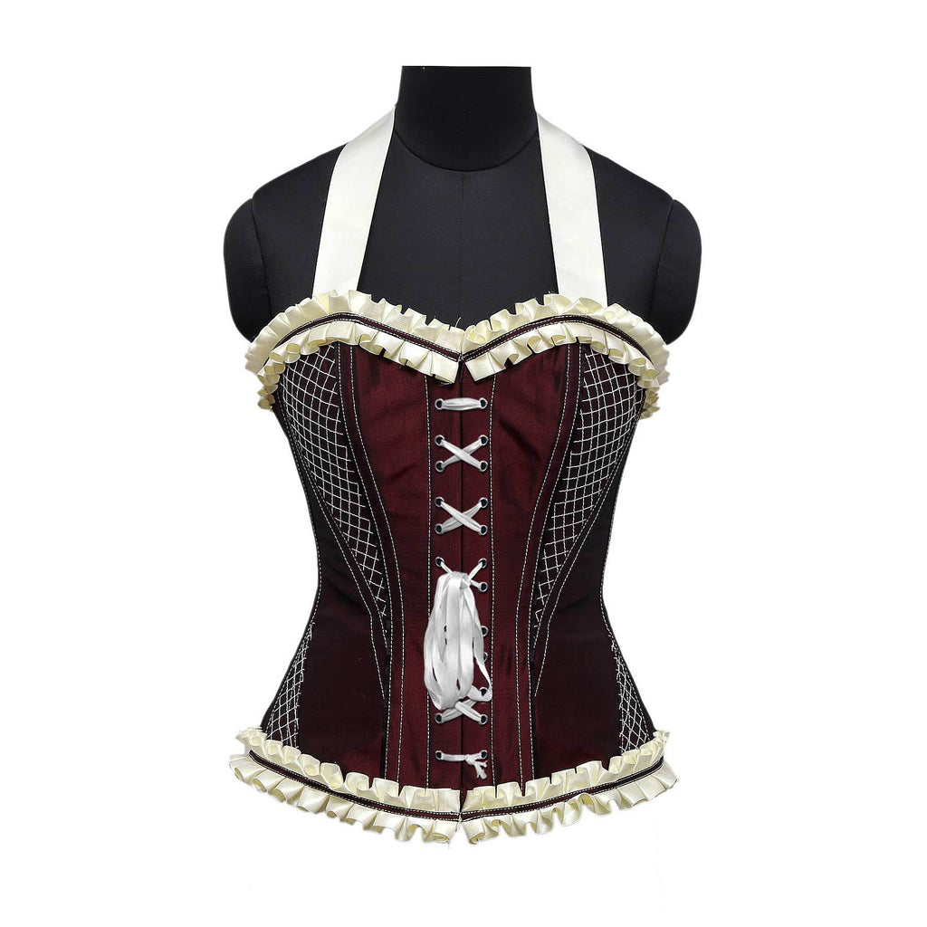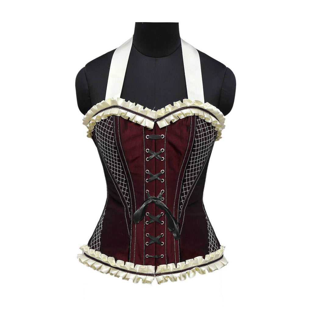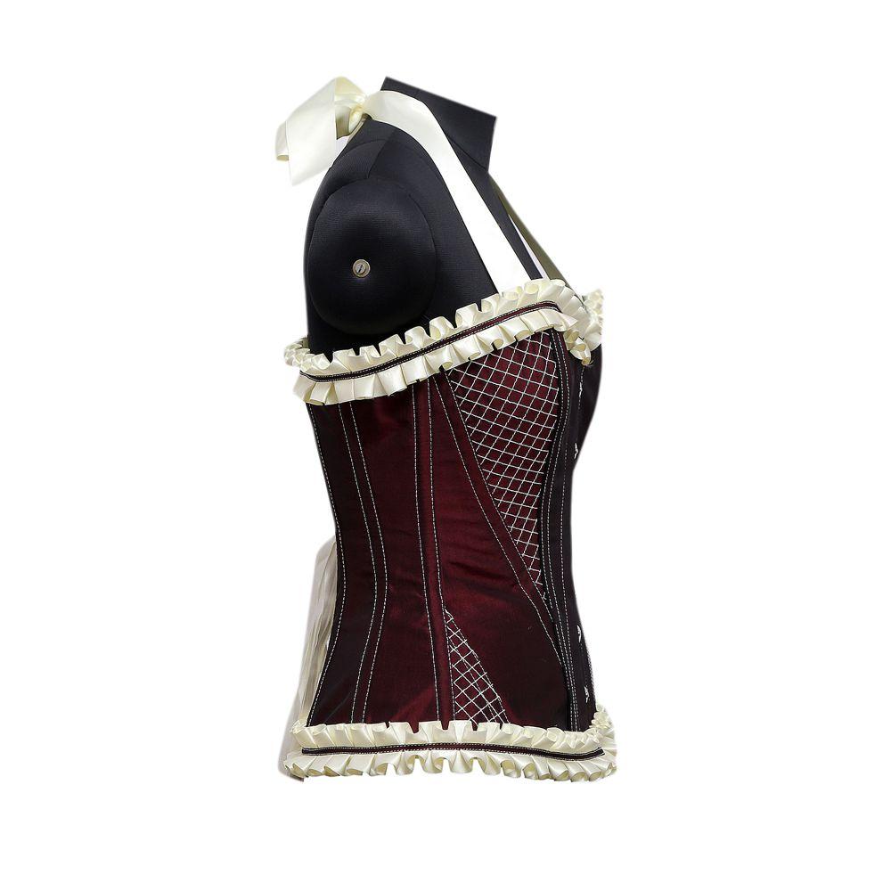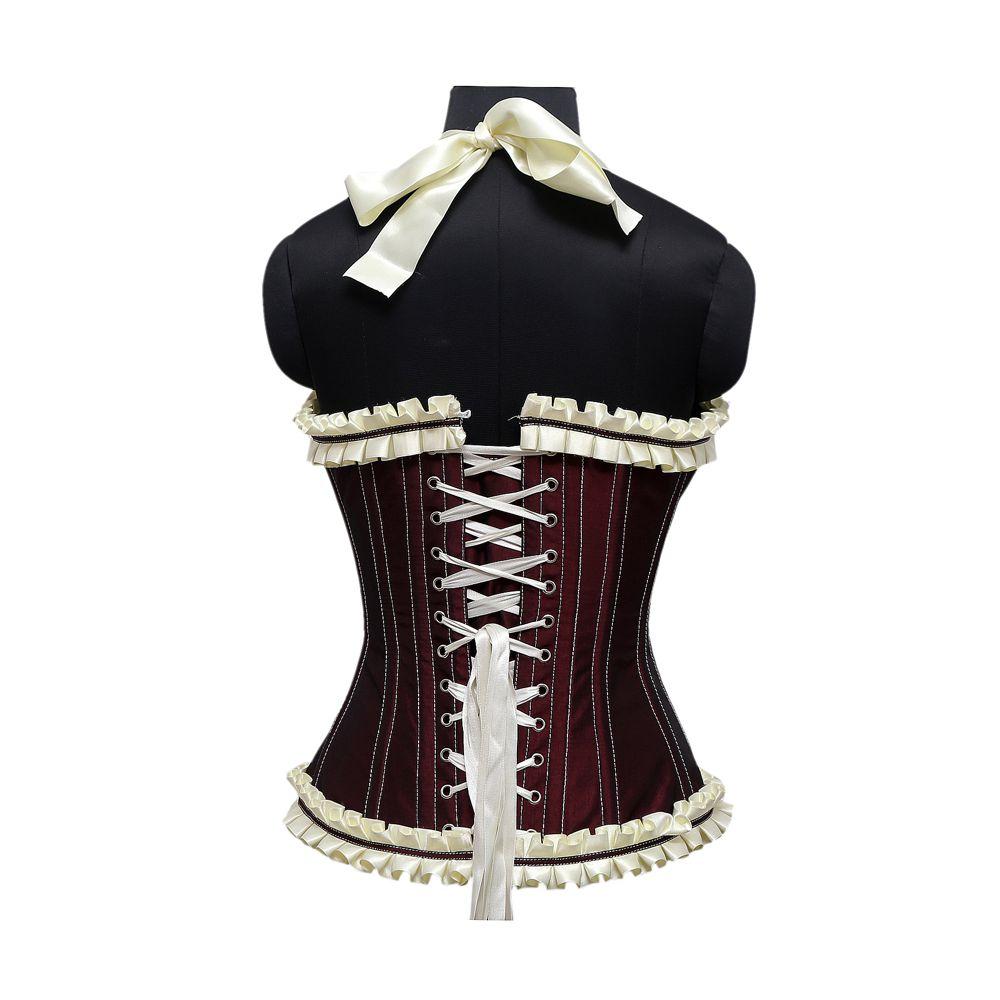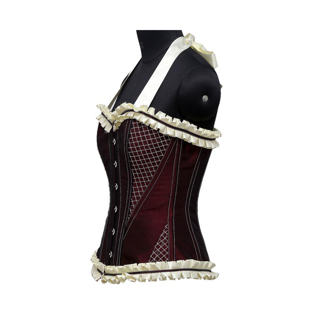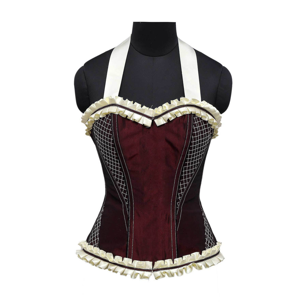 • Burgundy Maroon Embroidery Taffeta Strap Overbust Corset